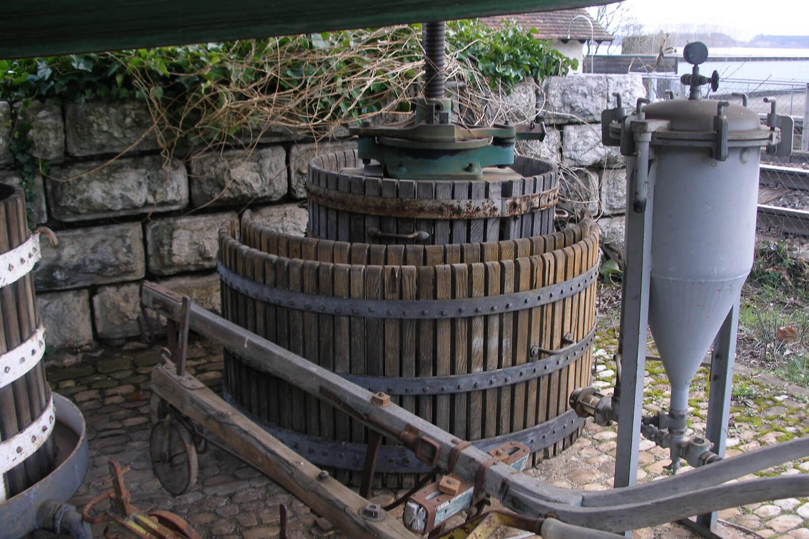 Les pièces maîtresses sont un chariot à fûts de stockage et un chariot de chargement, un grand pressoir sur un socle en granit dans la cour intérieure et un grand pressoir du 18e siècle dans la cave à fûts. La cave abrite également plusieurs grands fûts de cave provenant d’entreprises régionales, dont un fût de 8000 litres en bois de chêne. Une tonnellerie pratiquement complète et une distillerie en font également partie. A ces grands objets s’ajoutent de nombreux plus petits fûts et tonneaux, bouteilles, brantes, gerles et seilles, des outils utilisés dans les vignobles pour l’entretien des sols et des plantes, ainsi que des outils de cave tels que des pompes, des machines à embouteillage et de bouchage.