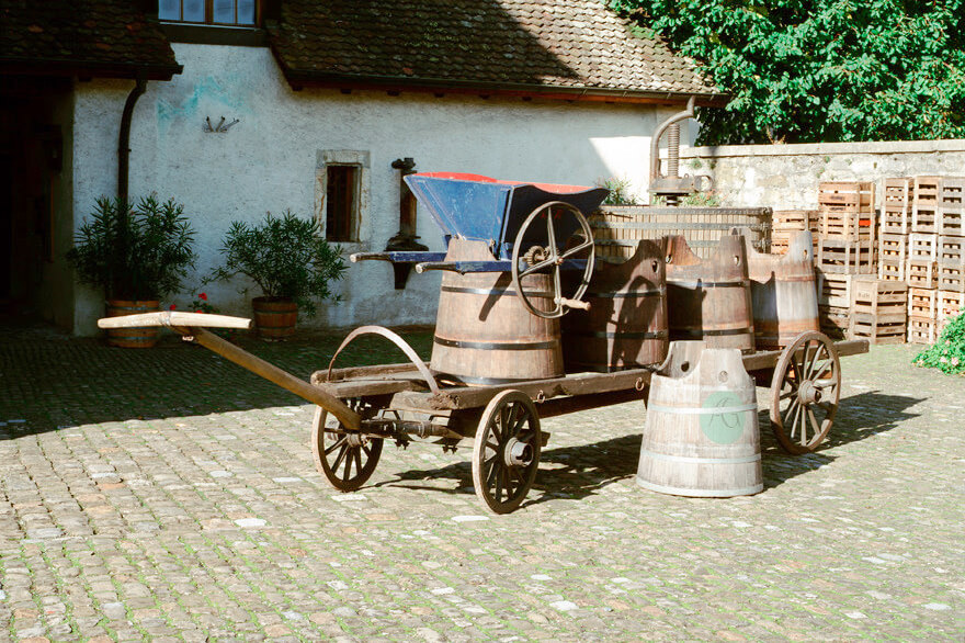 Prunkstücke sind ein Lagerfasswagen und ein Zuberwagen, eine grosse Presse (Trüel) auf einem Granitsockel im Innenhof und ein grosser Trüel aus dem 18. Jh. im Fasskeller. Im Keller befinden sich auch mehrere grosse Kellerfässer aus regionalen Betrieben, darunter ein 8100-Liter-Fass aus Eichenholz. Auch eine praktisch vollständige Küferei und eine Brennerei gehören dazu. Ergänzt werden diese grossen Stücke durch unzählige kleinere Fässer und Fässchen, Flaschen, Brenten, Zuber und Züberchen, Werkzeug, welches im Rebberg zur Boden- und Pflanzenpflege gebraucht wurde, sowie Kellergerätschaften wie Pumpen, Abfüll- und Zapfmaschinen.