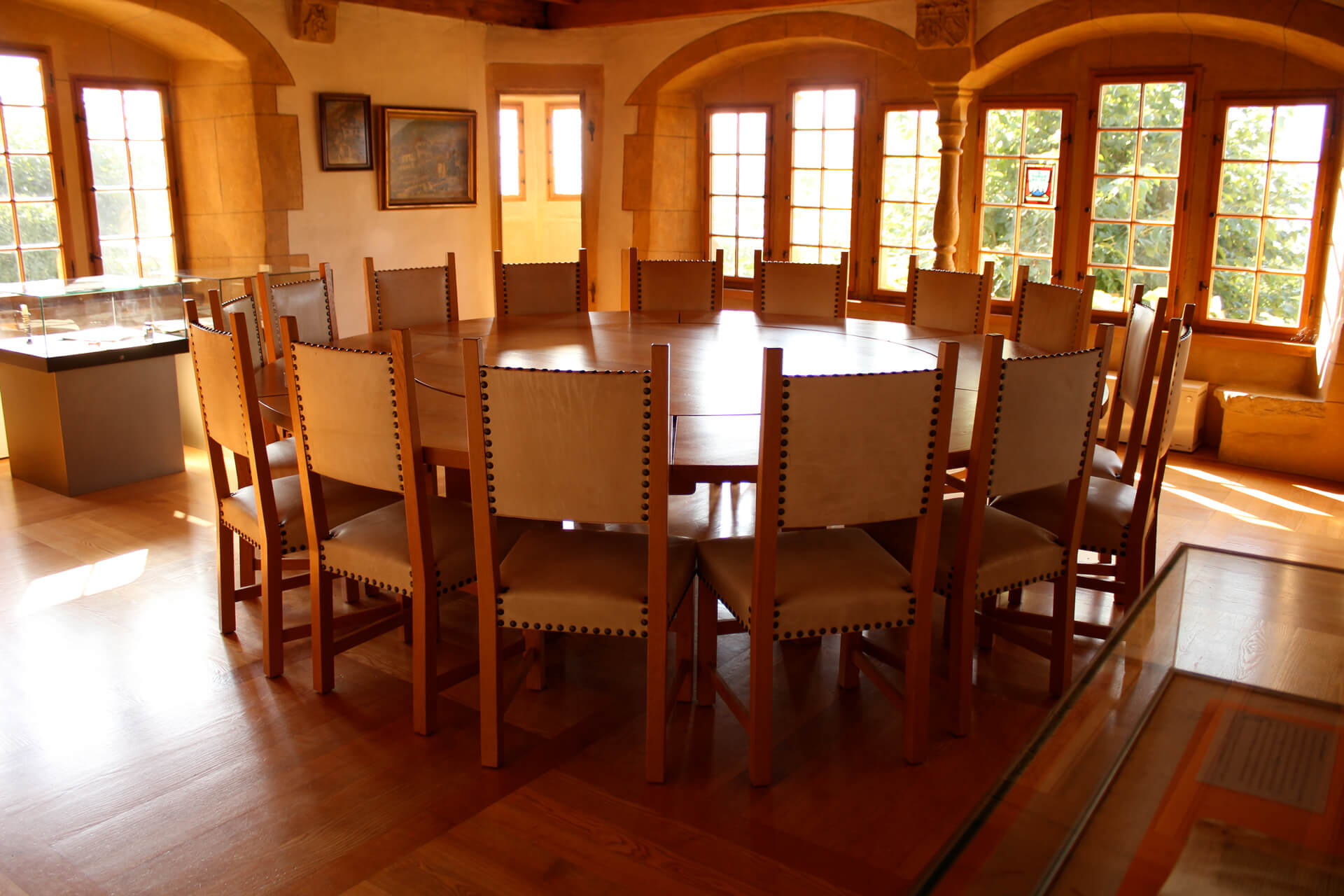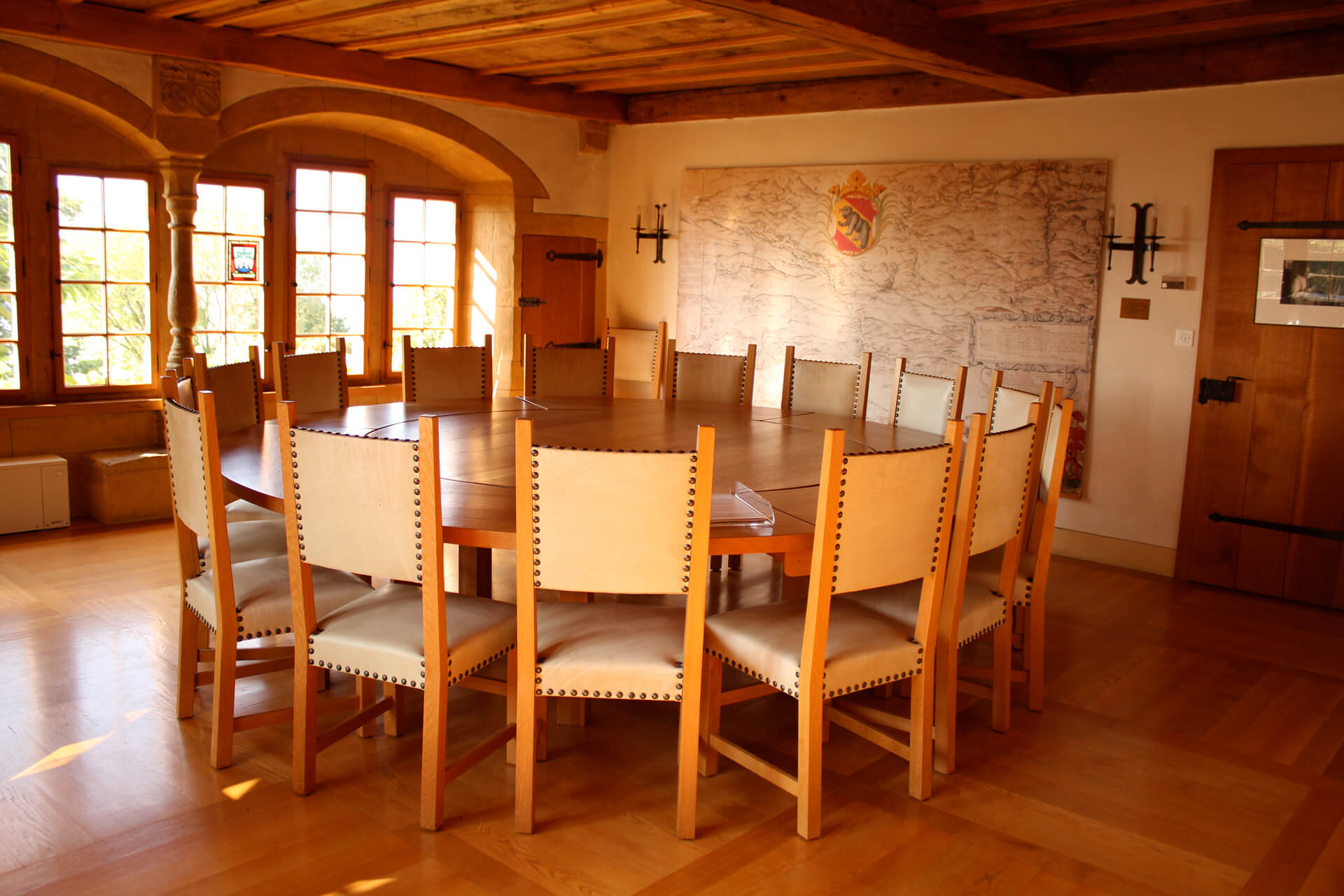 Der wunderschöne Erker, die gestaffelte Süd-Fensterfront mit Sicht auf Bielersee und St. Petersinsel und das speziell für diesen Saal hergestellte Mobiliar unterstreichen die gediegene Atmosphäre dieses Raumes. Der runde überdimensionale Tisch eignet sich ideal für Sitzungen.